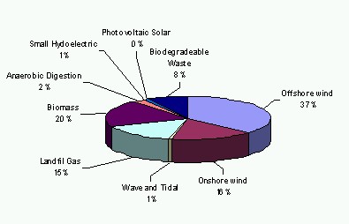 The mix of different renewable energy technologies used in the UK is a product of capacity in terms of land, fuel, etc the cost restrictions, and technological barriers. Regional planning assessments of how the 10% renewable electricity target might be met break down contributions from different technologies as follows: Landfill gas is an established and economic technology,